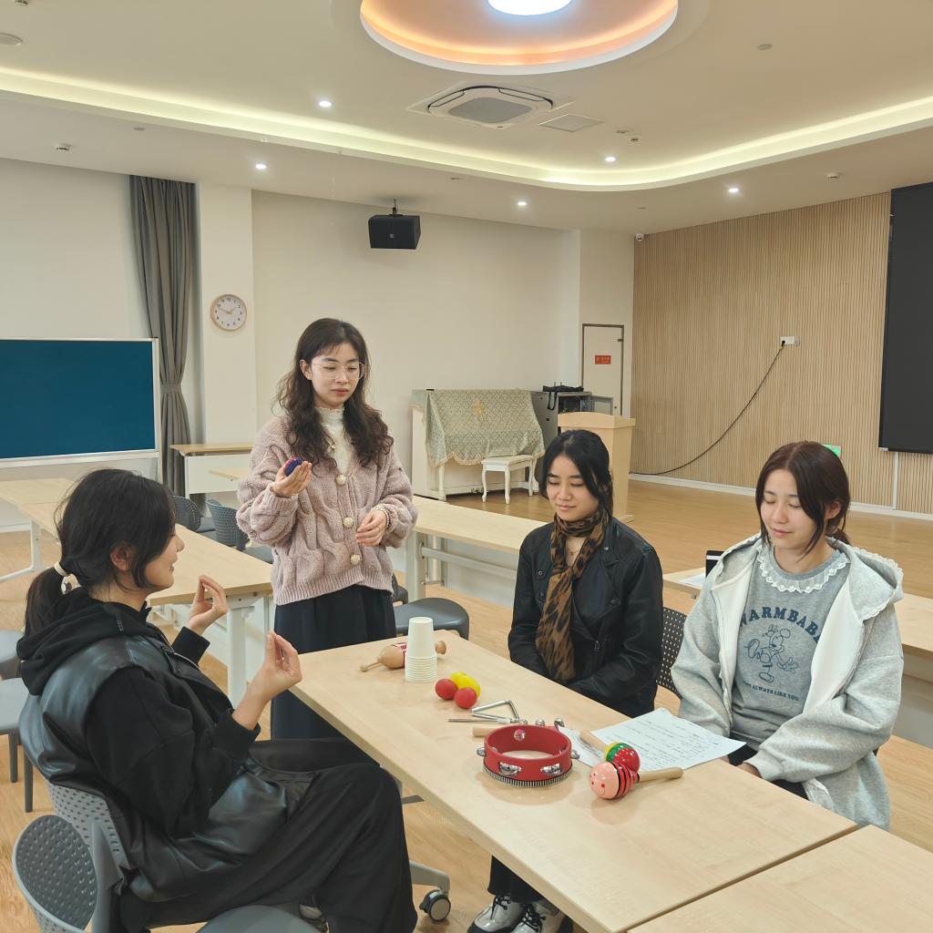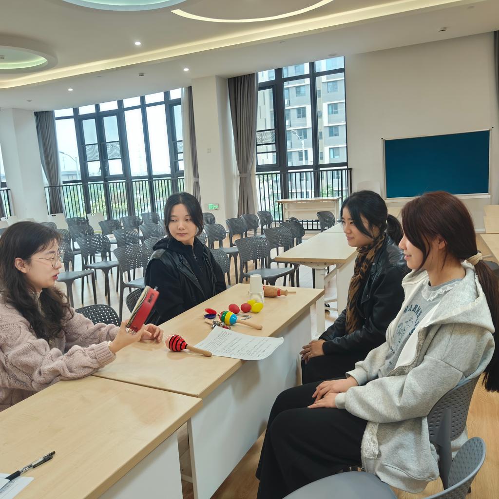 活动伊始,“乐器猜猜猜”环节迅速点燃现场氛围,社团成员们闭眼聆听,凭借对声音的敏感度猜测乐器种类。随后,活动进入“一人一器一分享”核心环节。每位社员携带自带的乐器依次完成三项任务。在乐器介绍环节,社员们详细讲解乐器的名称、材质及音色特点,如沙锤的清脆、手鼓的浑厚、自制米罐的颗粒感;示范玩法时,大家亲自演示简单演奏方式,摇、敲、拍等动作直观易懂;教学案例分享环节更是亮点纷呈,社员们结合经典儿歌与律动,展现乐器的教学价值,活动尾声,主持人对本次活动的亮点进行总结,并提出后续行动建议。